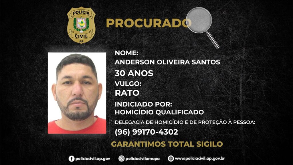 Nesta semana a Polícia Civil do Amapá através da Delegacia de Proteção à Pessoa (DHPP), divulgou imagens e pede ajuda da população para localizar Anderson Oliveira Santos o Vulgo Rato , indivíduo dono de vasta ficha criminal e está sendo investigado pela por homicídio cometido no bairro do Buritizal.