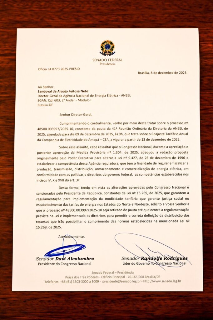 No ofício enviado ao diretor-geral da Aneel, Sandoval de Araújo Feitosa, Alcolumbre destaca que a MP 1.304/2025, aprovada no Congresso com emenda de sua autoria, criou um dispositivo que impede ou amortiza reajustes tarifários mediante a utilização de ativos da União para abater a tarifa.