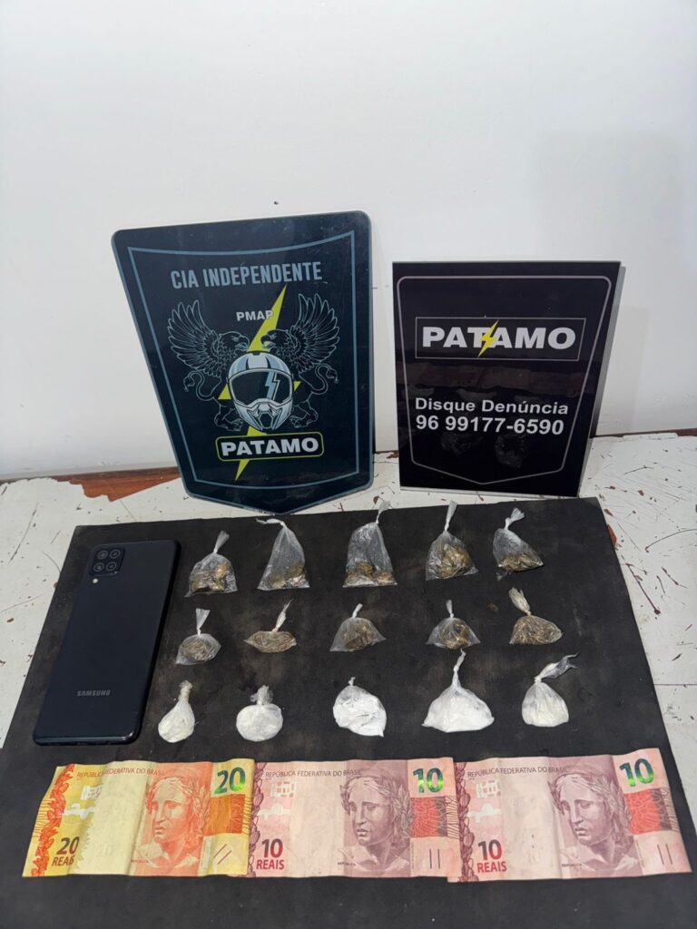 Na busca pessoal , foram encontrados no bolso do suspeito 5 porções de cocaína, 10 porções de maconha, o indivíduo já responde por tráfico de drogas , estando no regime aberto e utilizando tornozeleira eletrônica. Segundo a polícia foi preciso utilizar força proporcional pois o indivíduo demonstrava hostilidade a abordagem policial, diante dos fatos , o indivíduo foi preso e apresentado no Ciosp para as providências necessárias.