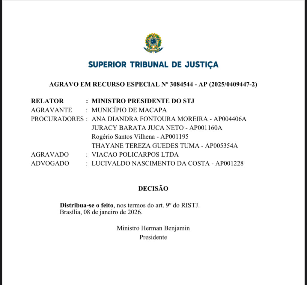 A insistência da Prefeitura de Macapá em recorrer à Justiça para evitar o pagamento de uma dívida superior a R$ 14 milhões à empresa Viação Policarpos Ltda. (Siãothur) acaba de ganhar mais um capítulo — e com forte sabor de derrota anunciada. O ministro Herman Benjamin, presidente do Superior Tribunal de Justiça (STJ), determinou a distribuição do agravo em recurso especial interposto pelo Município a um dos ministros da Corte, movimento que marca, na prática, o último suspiro jurídico da administração municipal no caso.