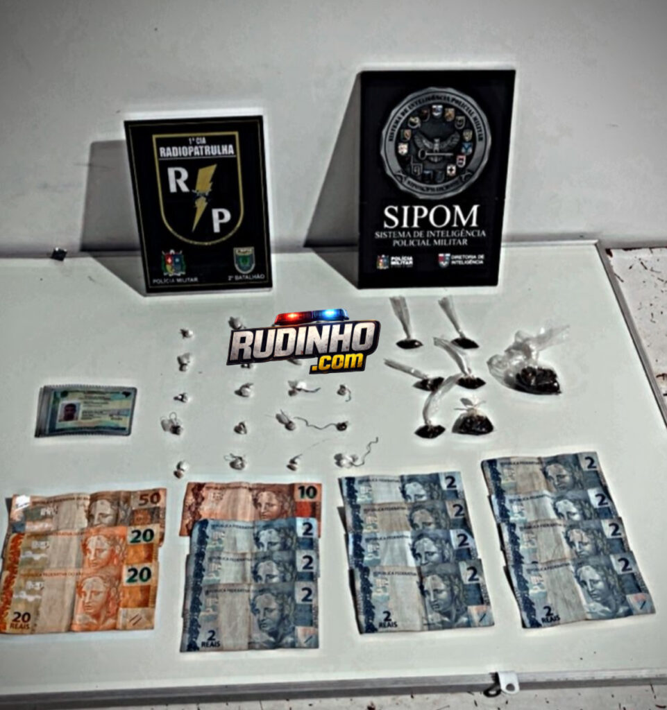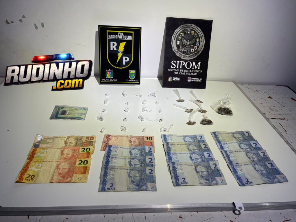 Rômulo Marques Cardoso, de 25 anos de idade , com passagem por latrocínio (roubo seguido de morte), com ele foi encontrado 20 porções de crack e 7 porções de maconha pequena e 1 grande , além de R$ 122 reais em espécie.
