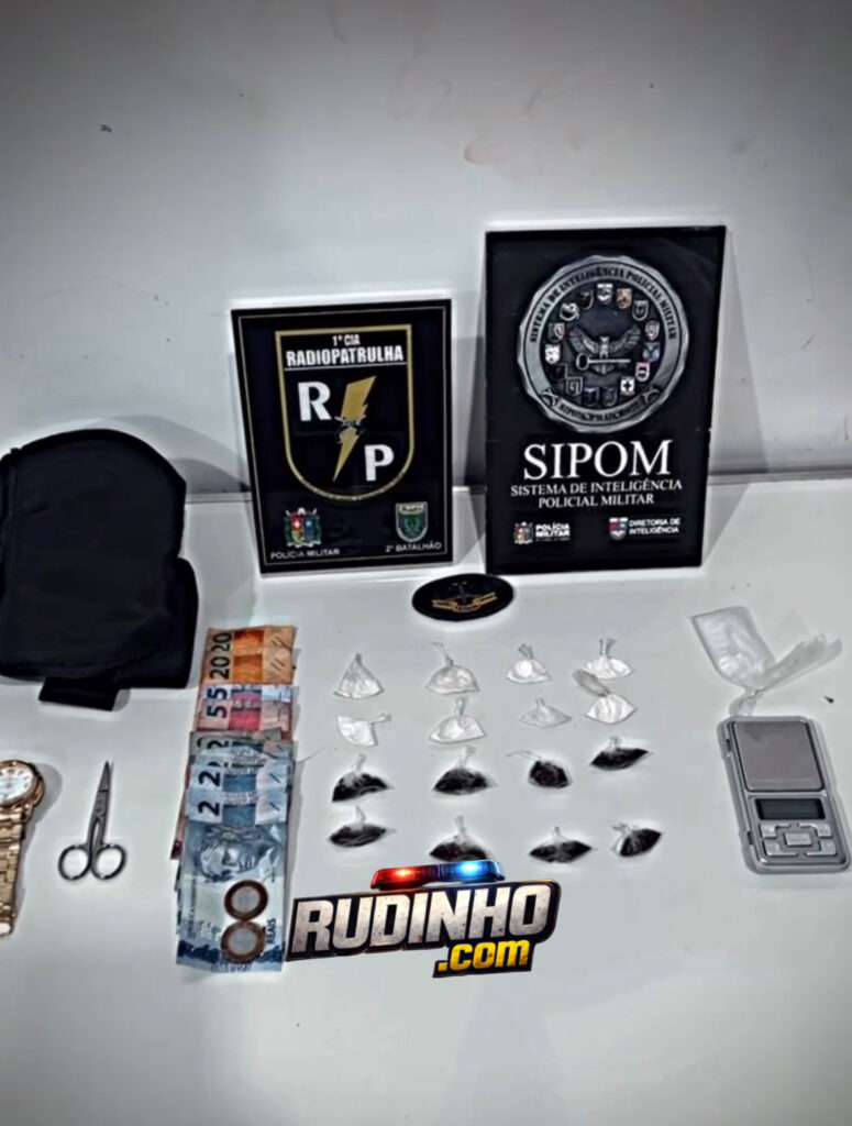 Ao chegarem no local os policiais fizeram o procedimento de abordagem em vários indivíduos, um deles identificado como Gabriel da Silva Corrêa Lima, ao ser feita busca pessoal foram encontrados no bolso de sua bermuda , 16 porções de drogas sendo 8 de cocaína e 8 de maconha e R$ 70 reais em espécie.