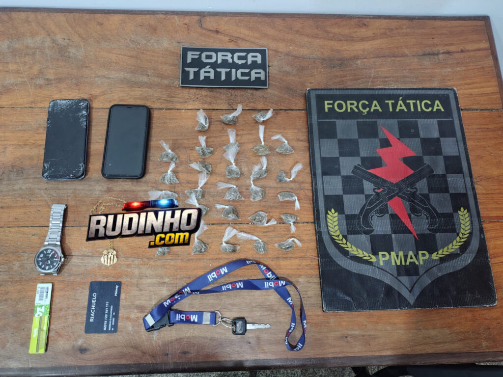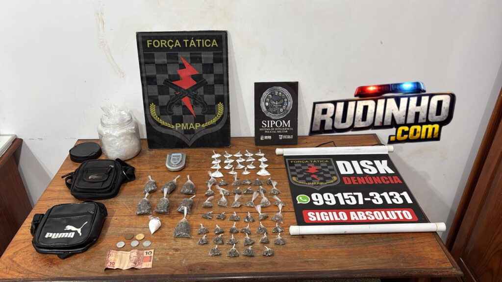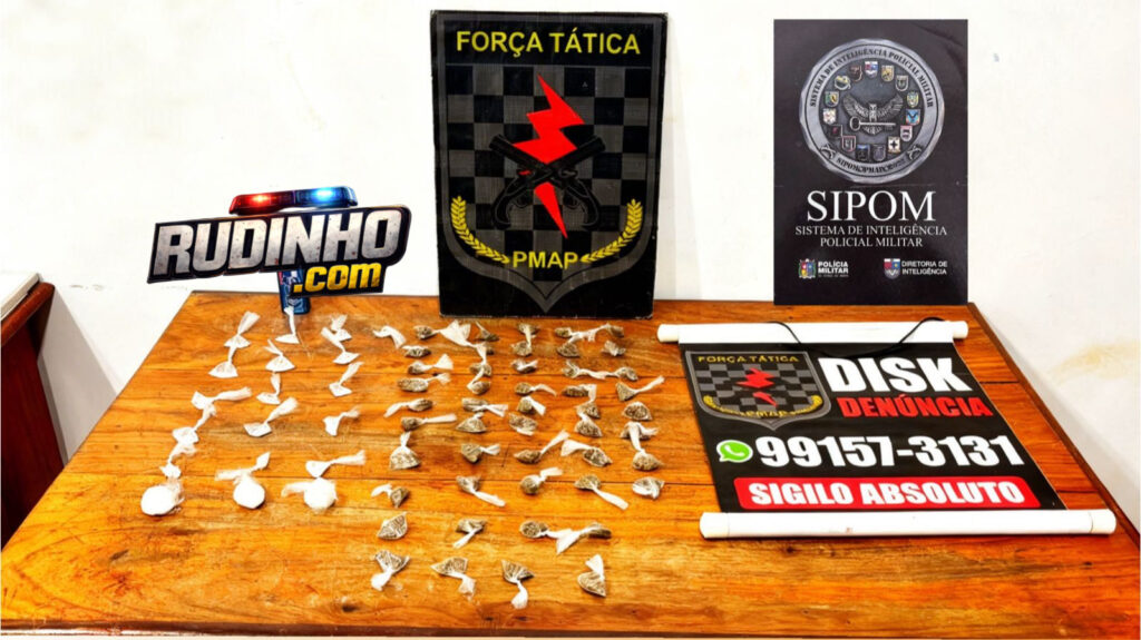 Durante a realização da operação Protetor, por volta das 8h de sexta feira (13.02), viaturas do Batalhão de Força Tática receberam, via sistema de Inteligência da PMAP, informações de que em uma das avenidas do bairro Congós havia uma residência onde estaria ocorrendo comercialização de entorpecentes e foragidos da justiça estavam homiziados, as equipes, em posse das informações repassadas na denúncia, se direcionaram até o local, ao realizarem as incursões em área de ponte, os policiais identificaram dois indivíduos empreendendo fuga, houve perseguição e os indivíduos foram alcançados pelas equipes, realizada a busca pessoal os agentes encontraram sob a posse dos suspeitos 67 porções de substâncias supostamente entorpecentes do tipo maconha e cocaína, e em busca no sistema constatou-se ainda que em desfavor de um dos suspeitos havia um mandado de prisão expedido pela justiça pela prática do crime de roubo.