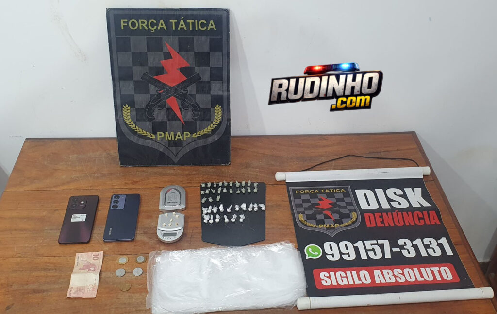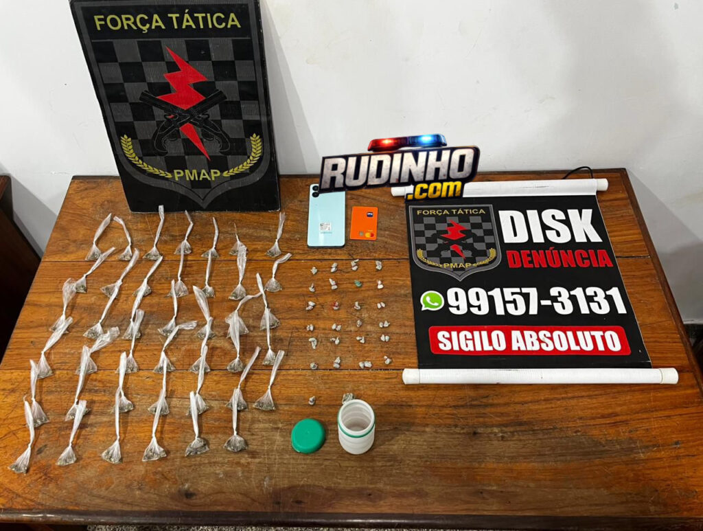 Na tarde de sábado (21.02), por volta de 16h30, uma equipe da Força Tática realizou incursão em uma área de ponte localizada no bairro do Muca. Os policiais identificaram um indivíduo que, ao notar a presença da equipe, dispensou um objeto ao solo e tentou empreender fuga a pé, porém não obteve êxito. Foi realizada a abordagem e apreendido o objeto dispensado pelo suspeito, sendo constatadas, no interior do frasco, diversas porções de substâncias supostamente entorpecentes do tipo crack e maconha. Diante dos fatos, a ocorrência foi apresentada no CIOSP do Pacoval.