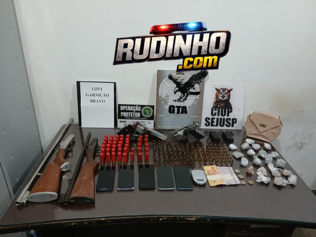 Na tarde desta segunda-feira 23/02, uma ação conjunta do Grupamento Tático Aéreo, Coordenadoria de Operações e Inteligência e IAPEN, resultou na prisão de 4 pessoas maiores de idade e 2 menores foram apreendidos. Armas de fogo e munição foram apreendidos além de entorpecentes e celulares.