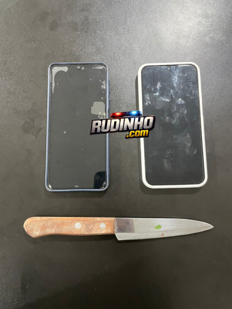 Ao chegarem no local a vítima foi localizada e contou aos policiais que dois homens sob grave ameaça com arma branca em punho , chegaram em uma lanchonete onde ela estava com o sobrinho, exigindo dinheiro e o telefone celular deles.