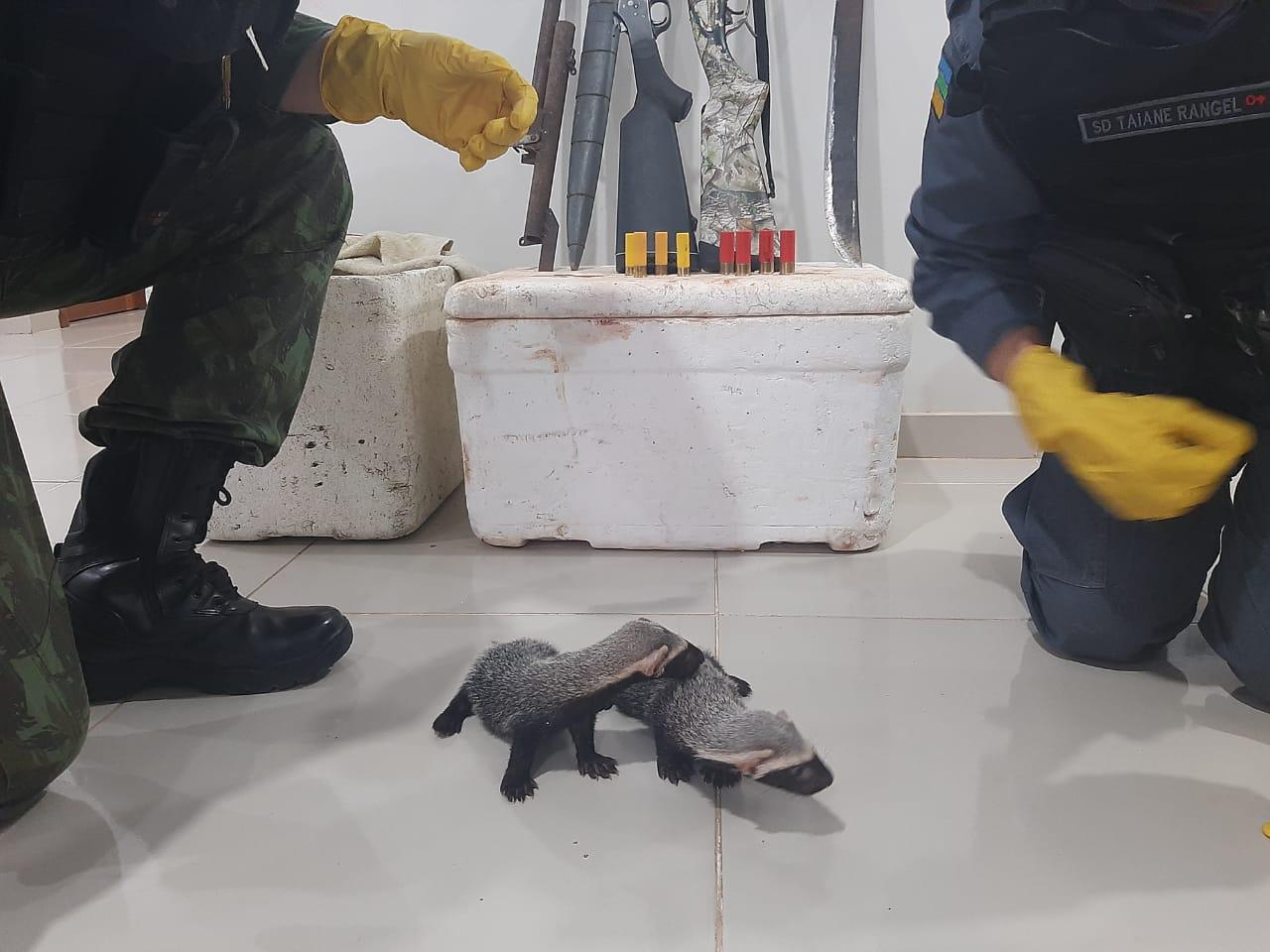 BATALHÃO AMBIENTAL PRENDE 3 HOMENS DUAS ARMAS DE FOGO E CARNE DE ANIMAL SILVESTRE DURANTE ABORDAGEM NA AP-010. AINDA FORAM APREENDIDOS DOIS ANIMAIS VIVOS.