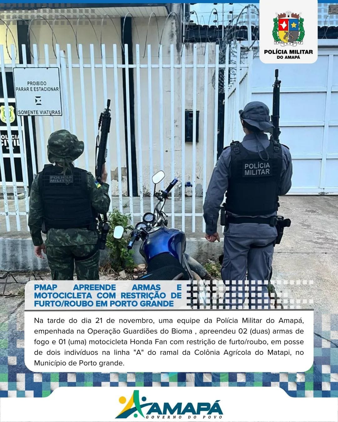 Na tarde do dia 21 de novembro, uma equipe da Polícia Militar do Amapá, empenhada na Operação Guardiões do Bioma , apreendeu 02 (duas) armas ...