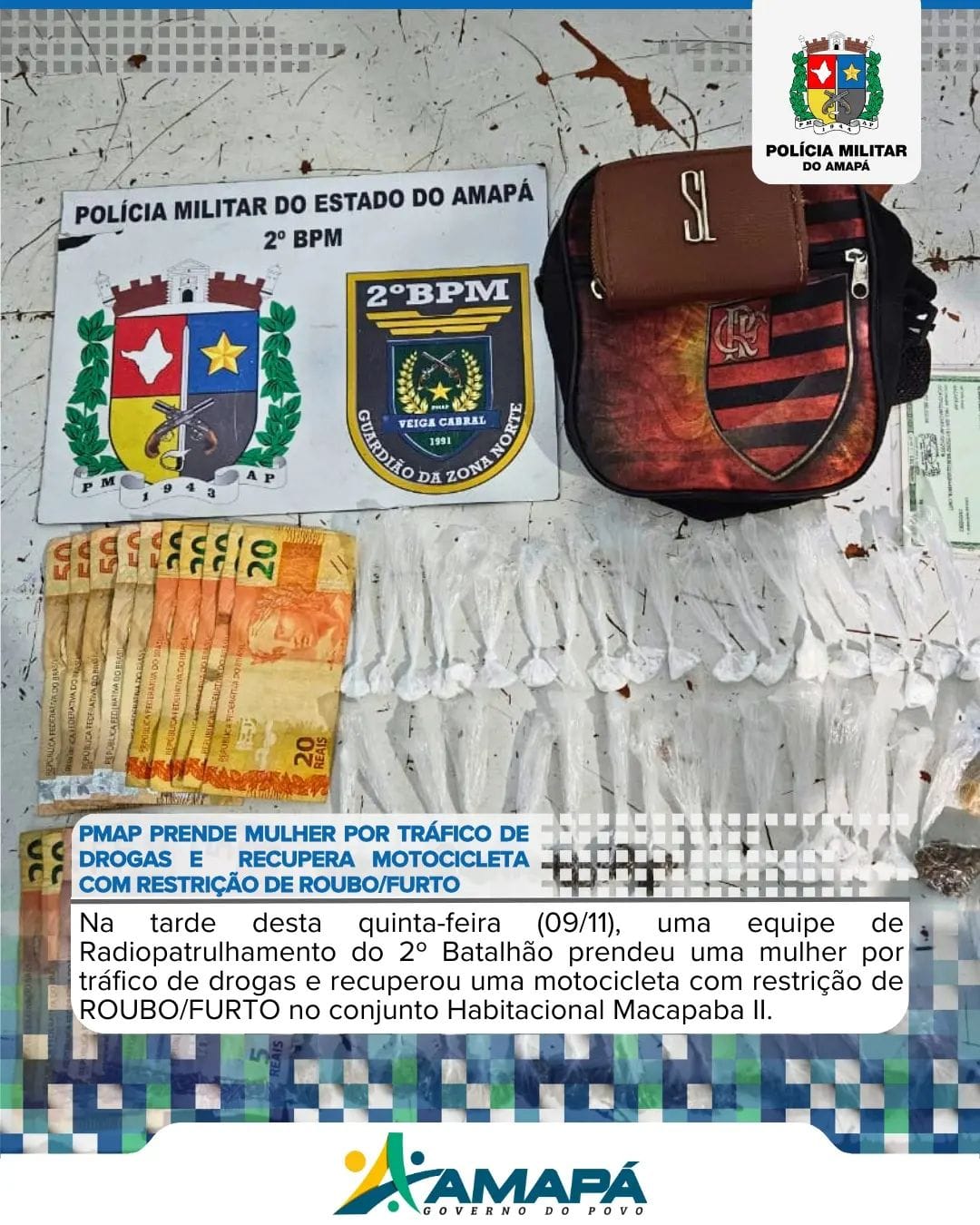 Na tarde desta quinta-feira (09/11), uma equipe de Radiopatrulhamento do 2º Batalhão prendeu uma mulher por tráfico de drogas e recuperou uma motocicleta com restrição de ROUBO/FURTO.