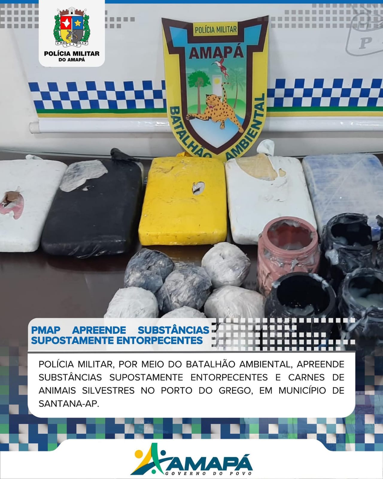 PM-AP APREENDE SUBSTÂNCIAS SUPOSTAMENTE ENTORPECENTESPOLÍCIA MILITAR, POR MEIO DO BATALHÃO AMBIENTAL, APREENDE SUBSTÂNCIAS SUPOSTAMENTE ENTORPECENTES E CARNES DE ANIMAIS SILVESTRES NO PORTO DO GREGO, NO MUNICÍPIO DE SANTANA-AP.