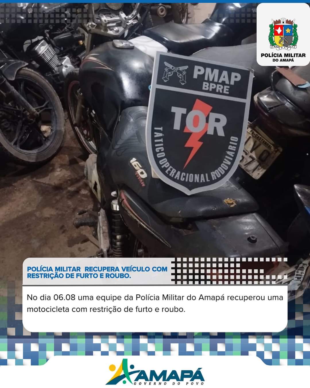 No dia 06.08 uma equipe do Tático Operacional Rodoviário –TOR/BPRE recupera motocicleta com restrição furto/roubo. Neste mesmo dia, a Equipe TOR recuperou outra motocicleta, pouco ...