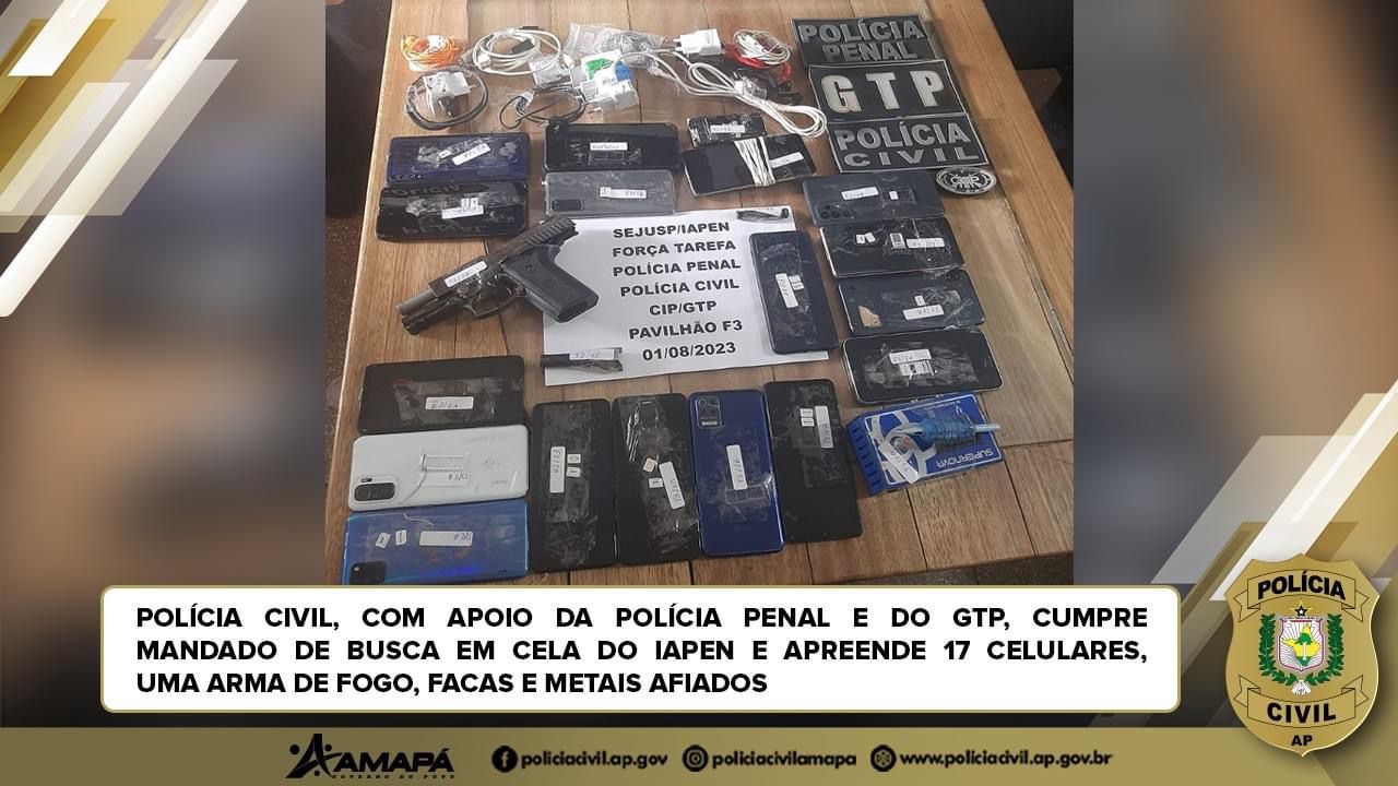 Delegacia de Homicídios, Polícia Penal e GTP, apreendeu 17 aparelhos celulares e uma arma de fogo, do tipo pistola, calibre 40, além de outros objetos como facas e metais afiados dentro do IAPEN.