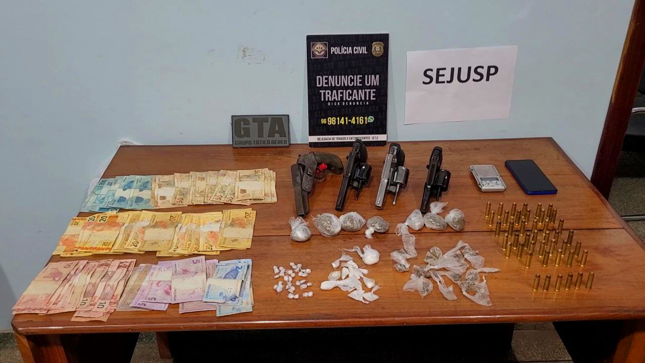 AÇÃO INTEGRADA ENTRE A POLÍCIA CIVIL, GTA E CIOP APREENDE QUATRO ARMAS DE FOGO, MUNIÇÕES, DROGAS E R$ 3 MIL