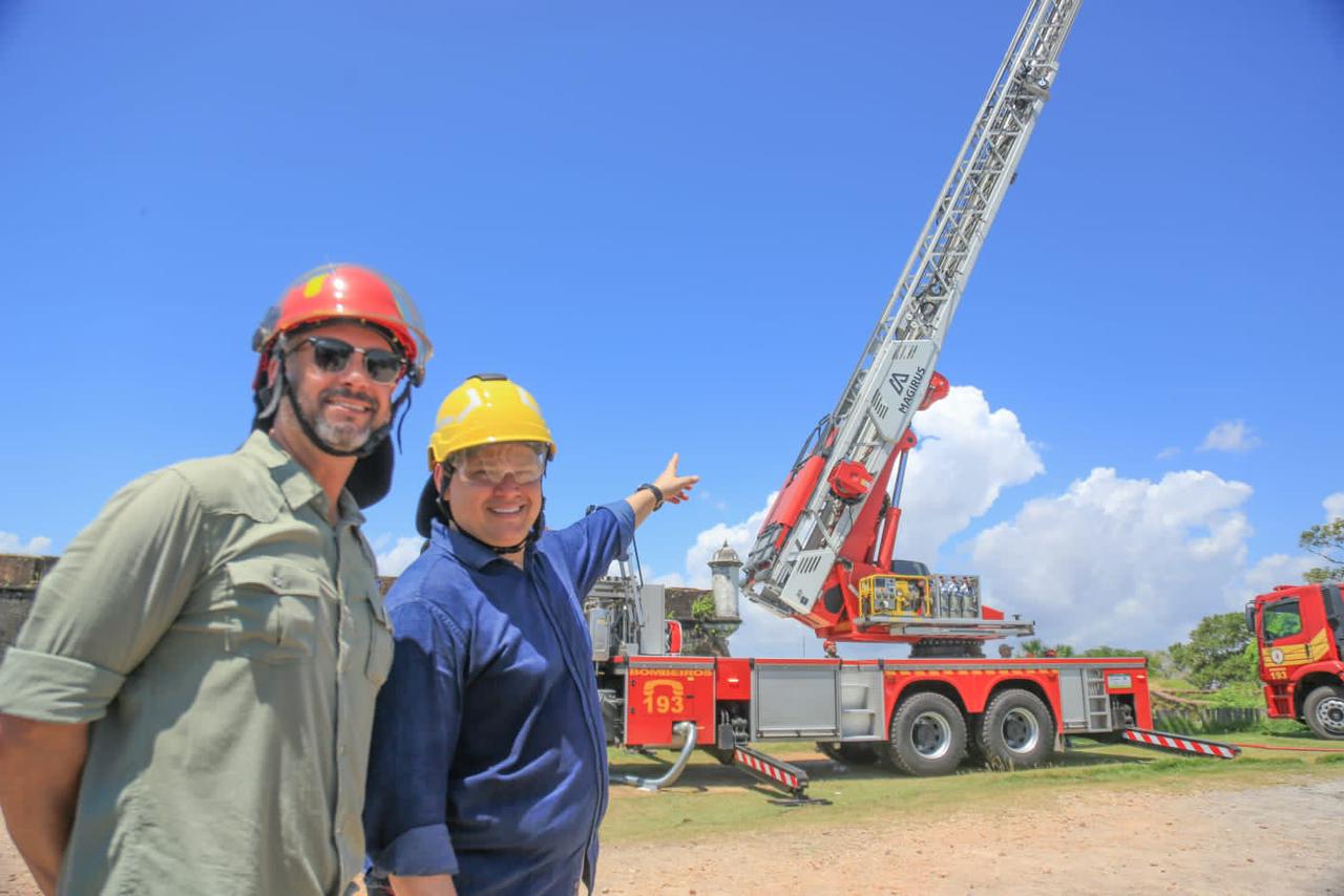 Governador e senador subiram no cesto de salvamento do caminhão Magirus para demonstrar o quanto o equipamento é moderno e seguro Senador articulou R$ 8 ...