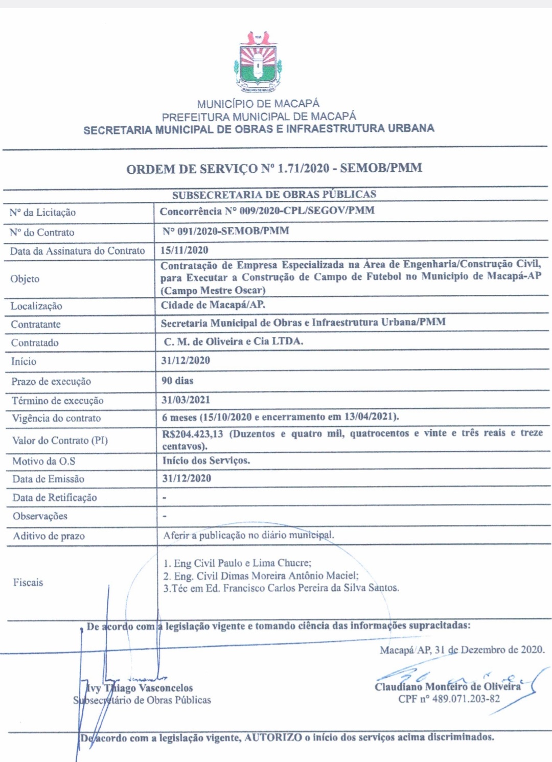 A prefeitura Municipal de Macapá deu ordem de serviço para a empresa CM DE OLIVEIRA E CIA LTDA. EPP para a construção de uma arena ...